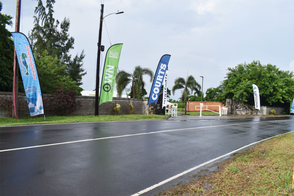 2: Entrance to The Village at Brotherson Estate on Saturday and Sunday November 2-3, showing flags of sponsors of the two Open Days – Island Purified Water, St. Kitts Nevis Anguilla National Bank, and Courts Ltd.