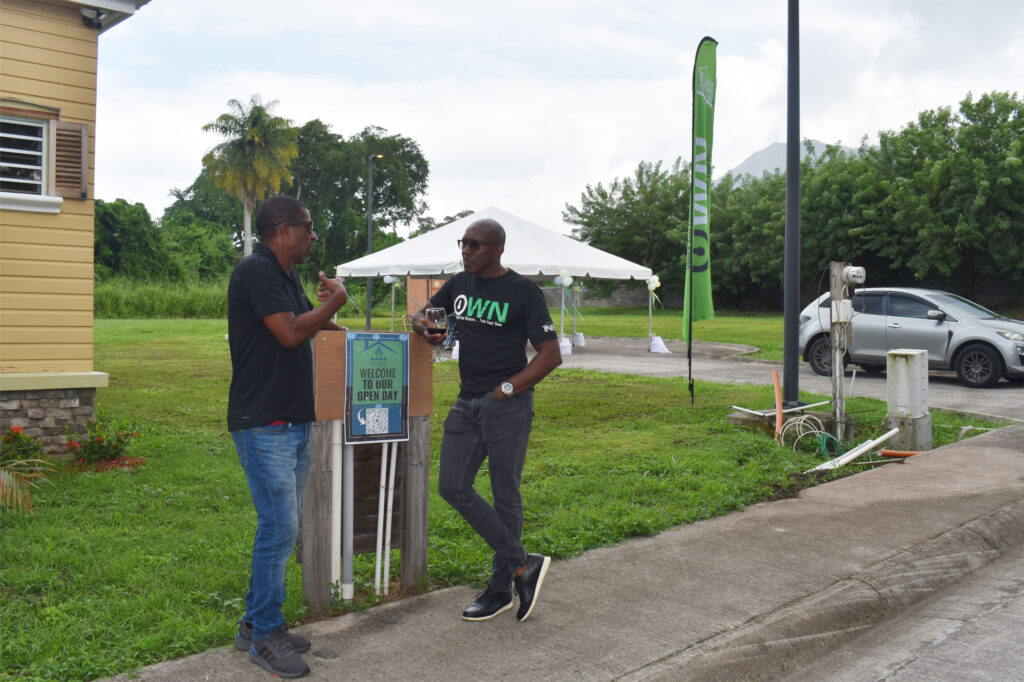 3: Mr David Lake (right), Group Commercial Head, St. Kitts-Nevis-Anguilla-National Bank Limited, discussing with the Chief Executive Officer and Managing Director of the Whitegate Development Corporation, Mr Ellis Hazel, outside one of the two show houses.