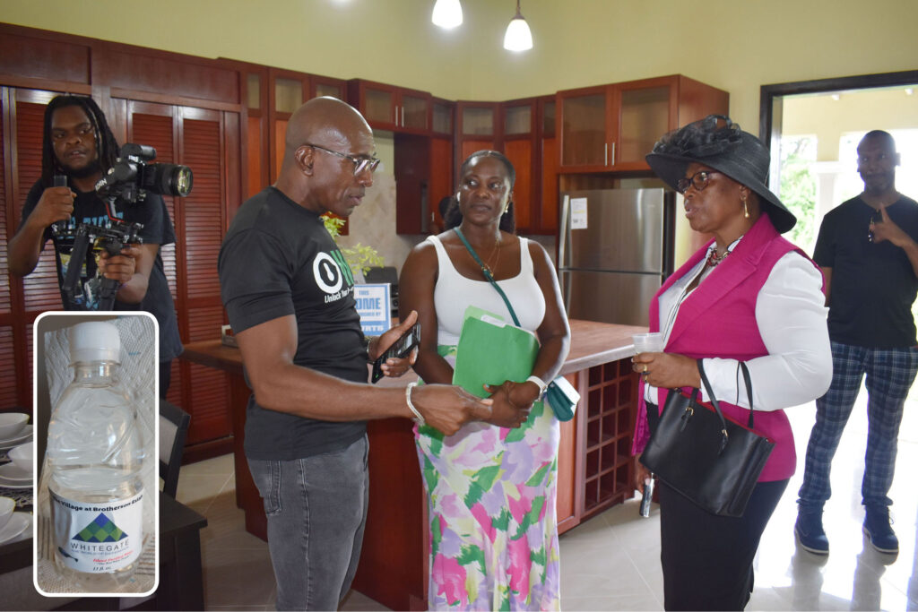 4: In support of The Village at Brotherson Estate: Mr David Lake of National Bank and Mrs Pandora Powell (right), a director of Island Purified Water, with Whitegate’s Accounts Officer Ms Ramona Benjamin. Inset: a Whitegate branded Island Purified Water bottle.